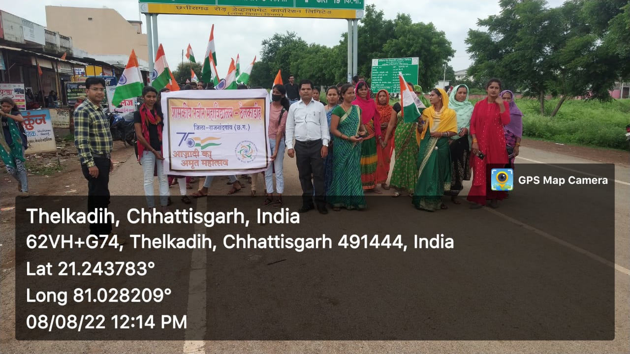 शासकीय नवीन महाविद्यालय ठेलकाडीह के प्राचार्य डॉ. एल. सी. सिन्हा सर के निर्देशन में एवं एन. एस. एस. अधिकारी श्री डी.के. साहू सर के मार्गदर्शन में दिनांक 08/08/2022 को आजादी के अमृत महोत्सव के अवसर पर महाविद्यालय के राष्ट्रीय सेवा योजना के स्वयंसेवकों द्वारा, “हर घर तिरंगा” कार्यक्रम को सफल बनाने हेतु जागरूकता रैली निकाली गई । जिसमे महाविधालय के सहायक प्राध्यापक श्री सी.एस. राठौर, श्री व्ही. के. मसियारे, सुश्री रेणुका कुंजाम, श्री बेनविक्रम बर्मन, श्री अविनाश कुमार, श्रीमती रेणुका सिन्हा एवं स्वयं सेवक कु. प्रभा देवांगन , महेश्वरी यदु, अंजली देवांगन, गीता वर्मा , माधुरी साहू, रेणुका जांगड़े, कुमेश्वरी पाल, अनुसूइया देवांगन, कुलेश्वरी साहू, लोकेश देवांगन, मनोहर निषाद, प्रदीप साहू, अरुणा, सावित्री बघेल, उमेश पाल, तोरण वर्मा एवं अन्य विद्यार्थियों की सक्रिय भागीदारी रही।